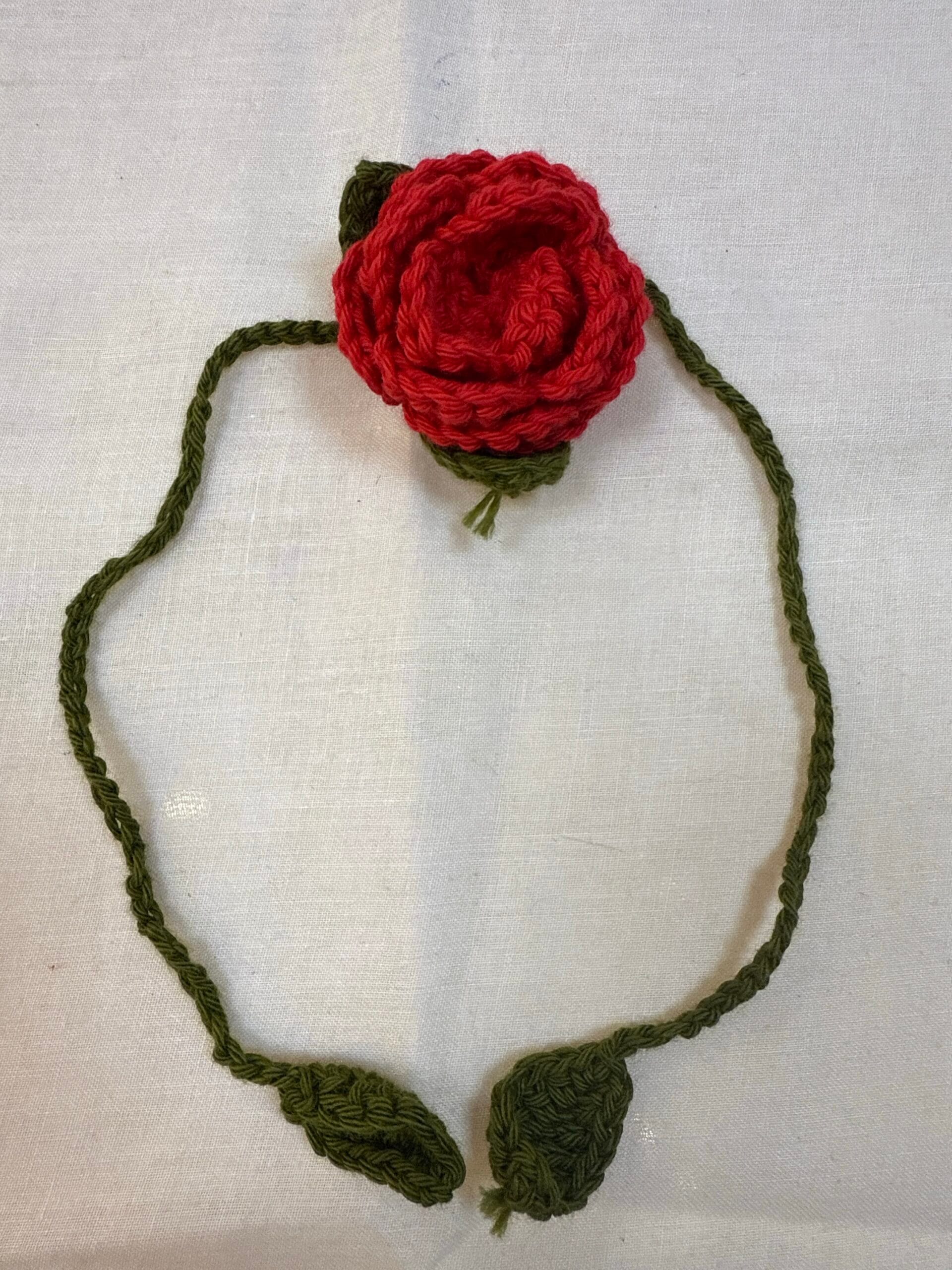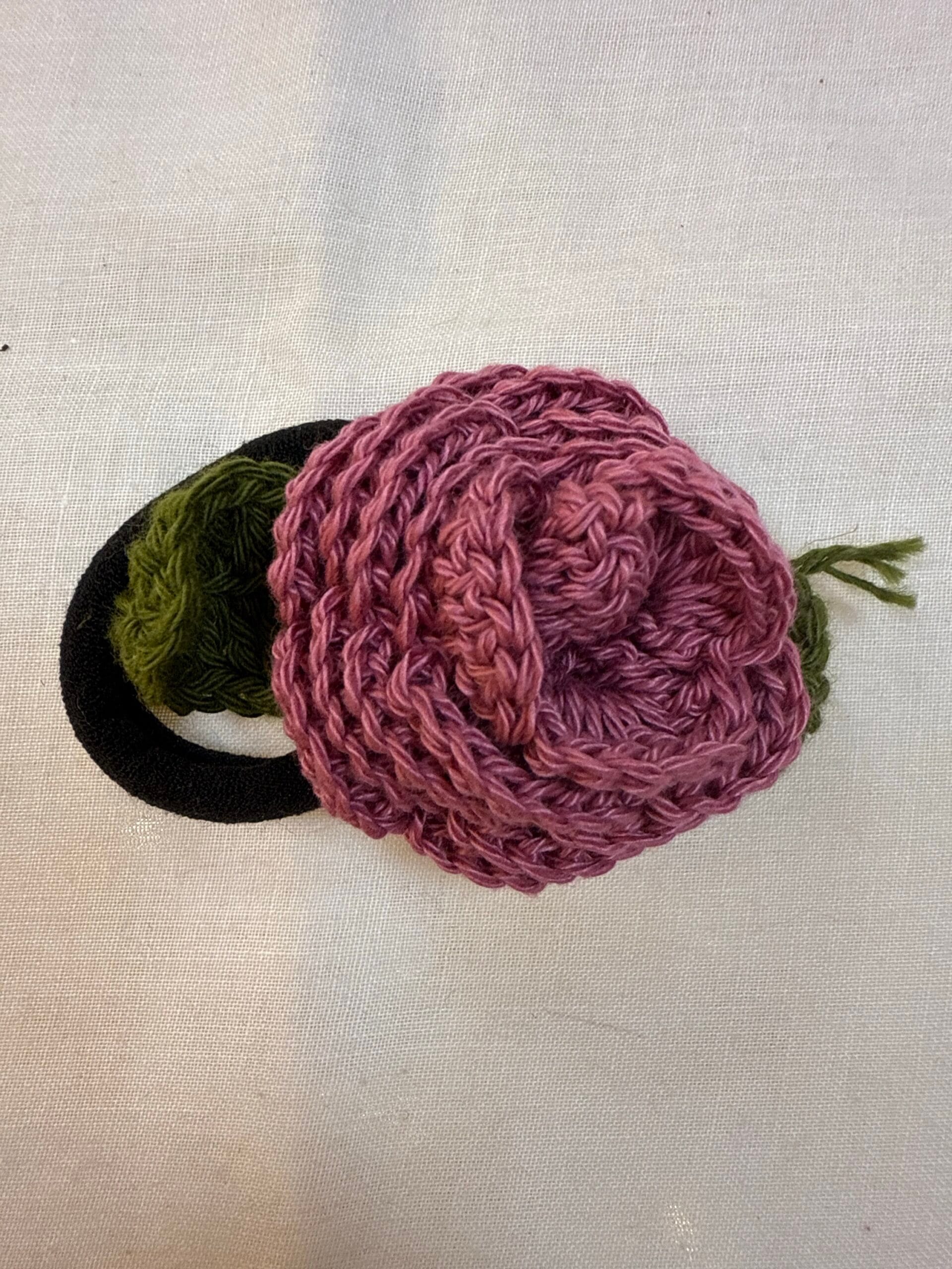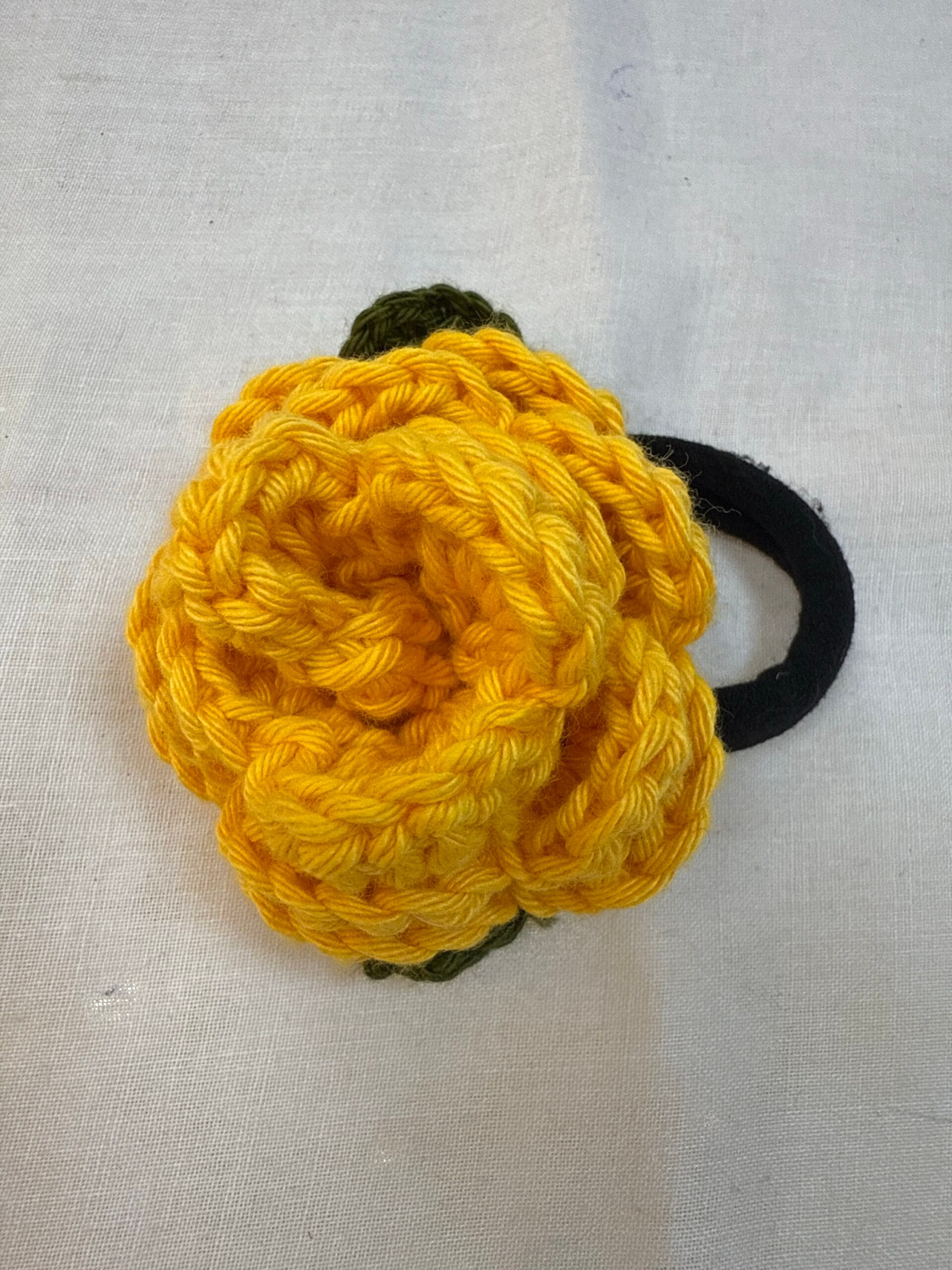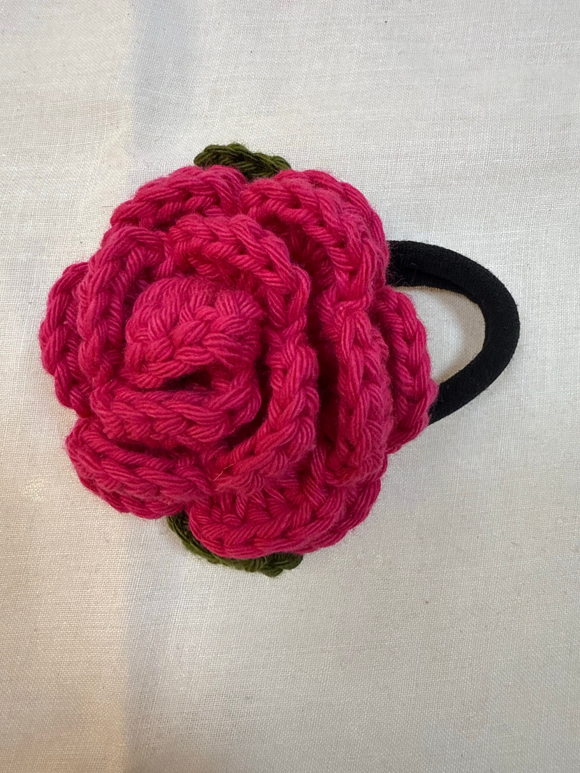 This crochet rubber band features a vibrant red rose with green leaves, adding a charming floral touch to your accessories.