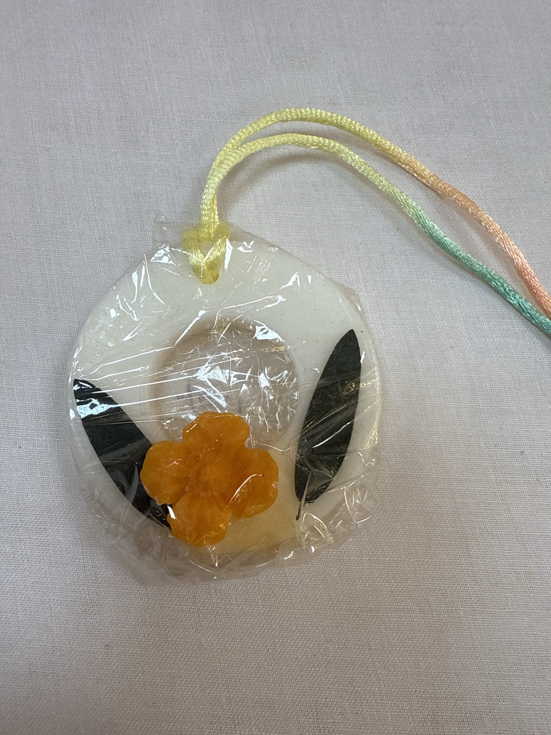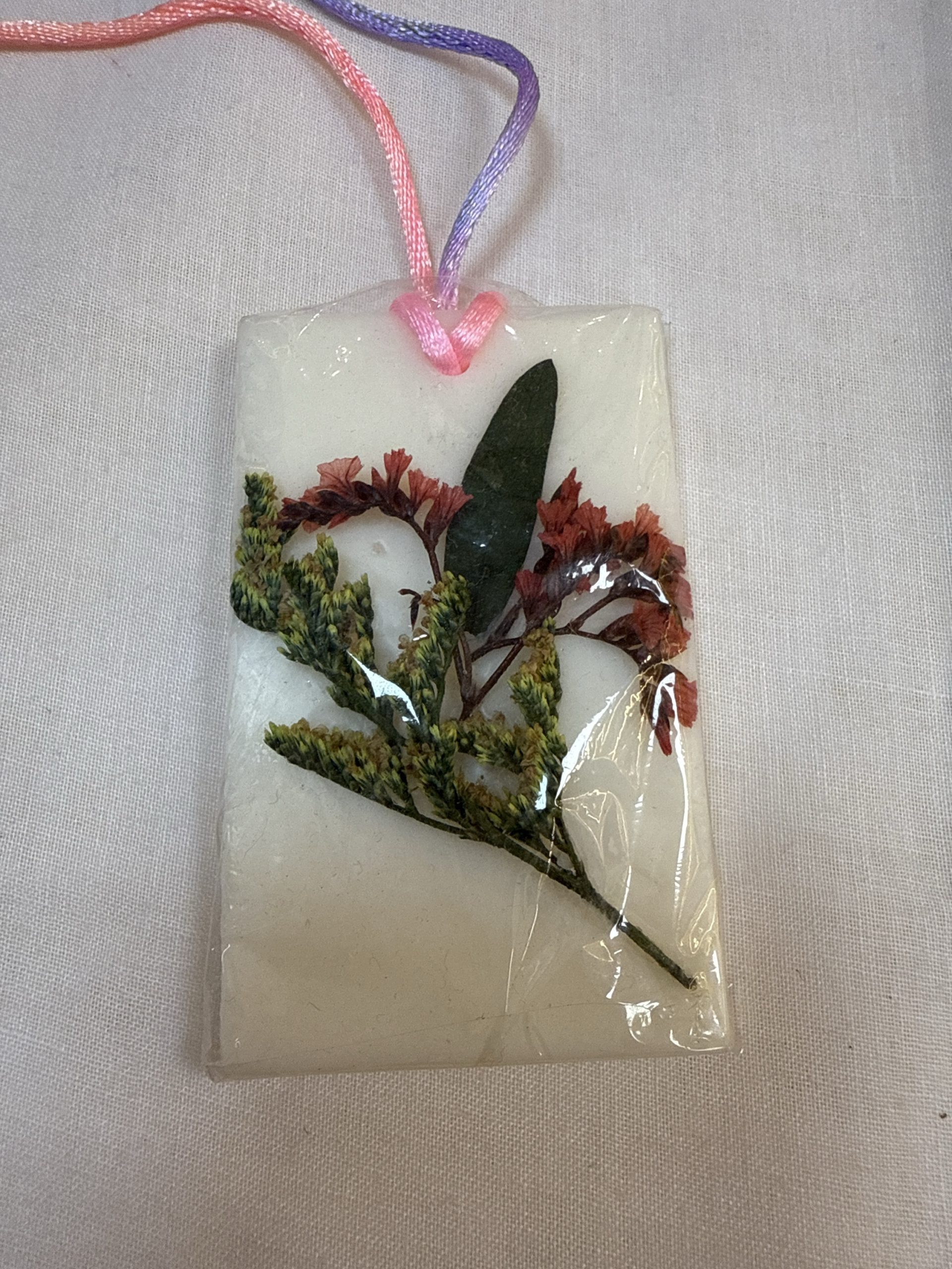 A translucent fragrance sachet encases vibrant red flowers and green leaves, tied with a pink and purple string.