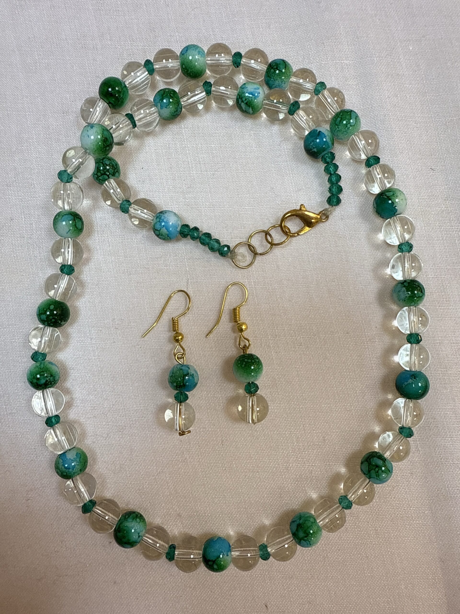 Accessories set features a green and clear glass bead necklace with matching earrings, accented by gold-toned hooks.