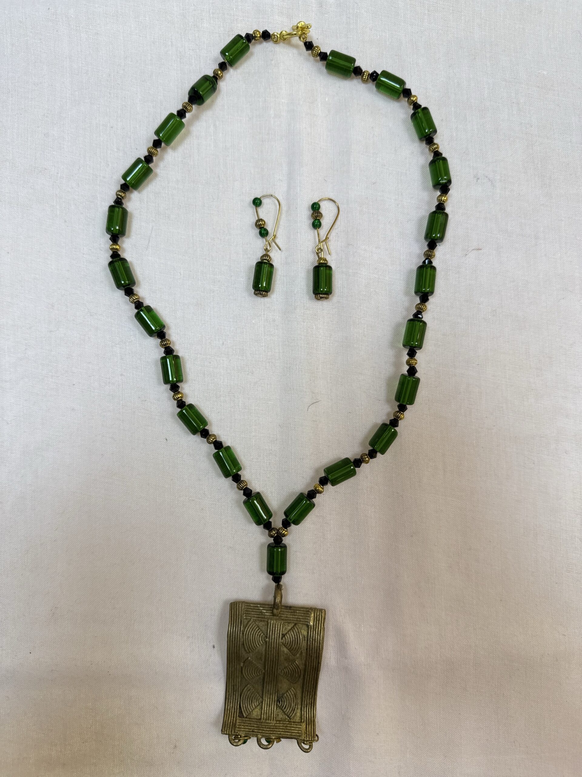 Accessories set features green glass beads and a brass pendant with intricate swirl patterns, complemented by matching earrings.