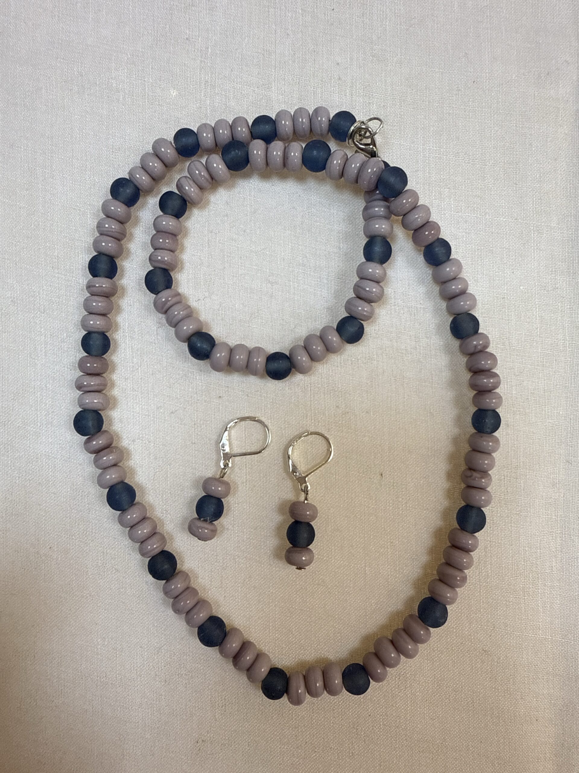 Grey beads necklace with matching earrings, featuring smooth, matte-finished beads in a gradient of soft and dark tones for a versatile look.