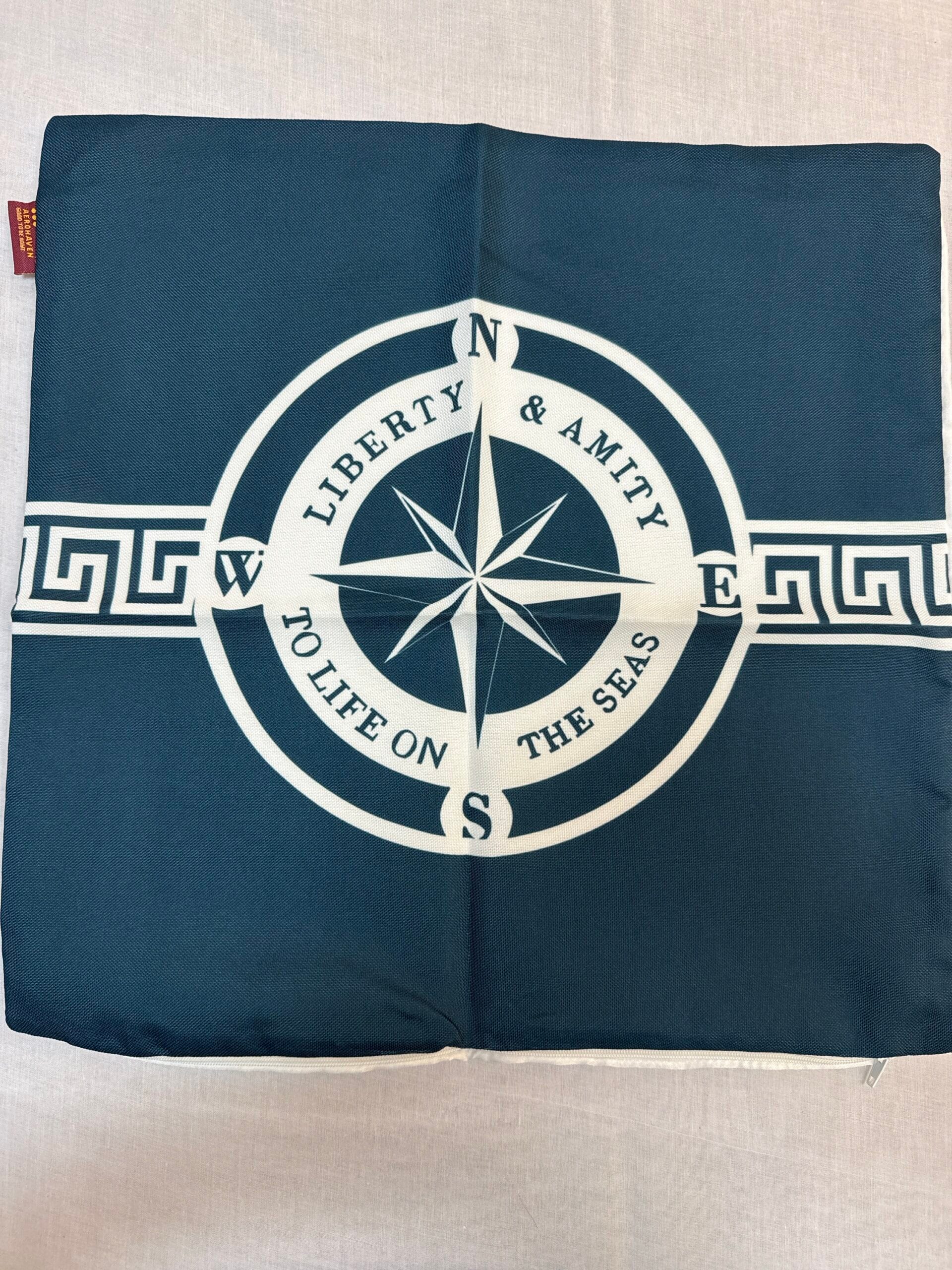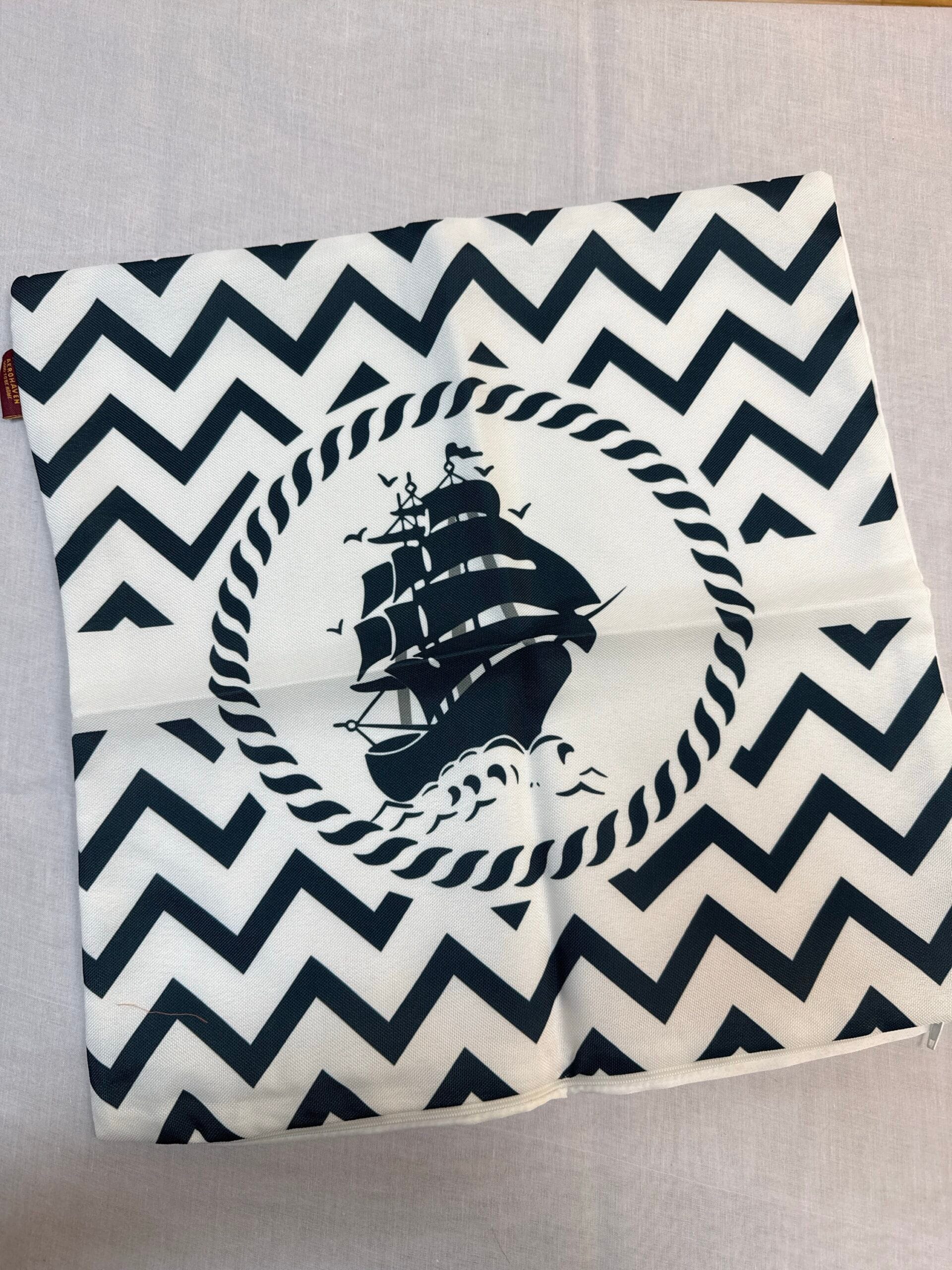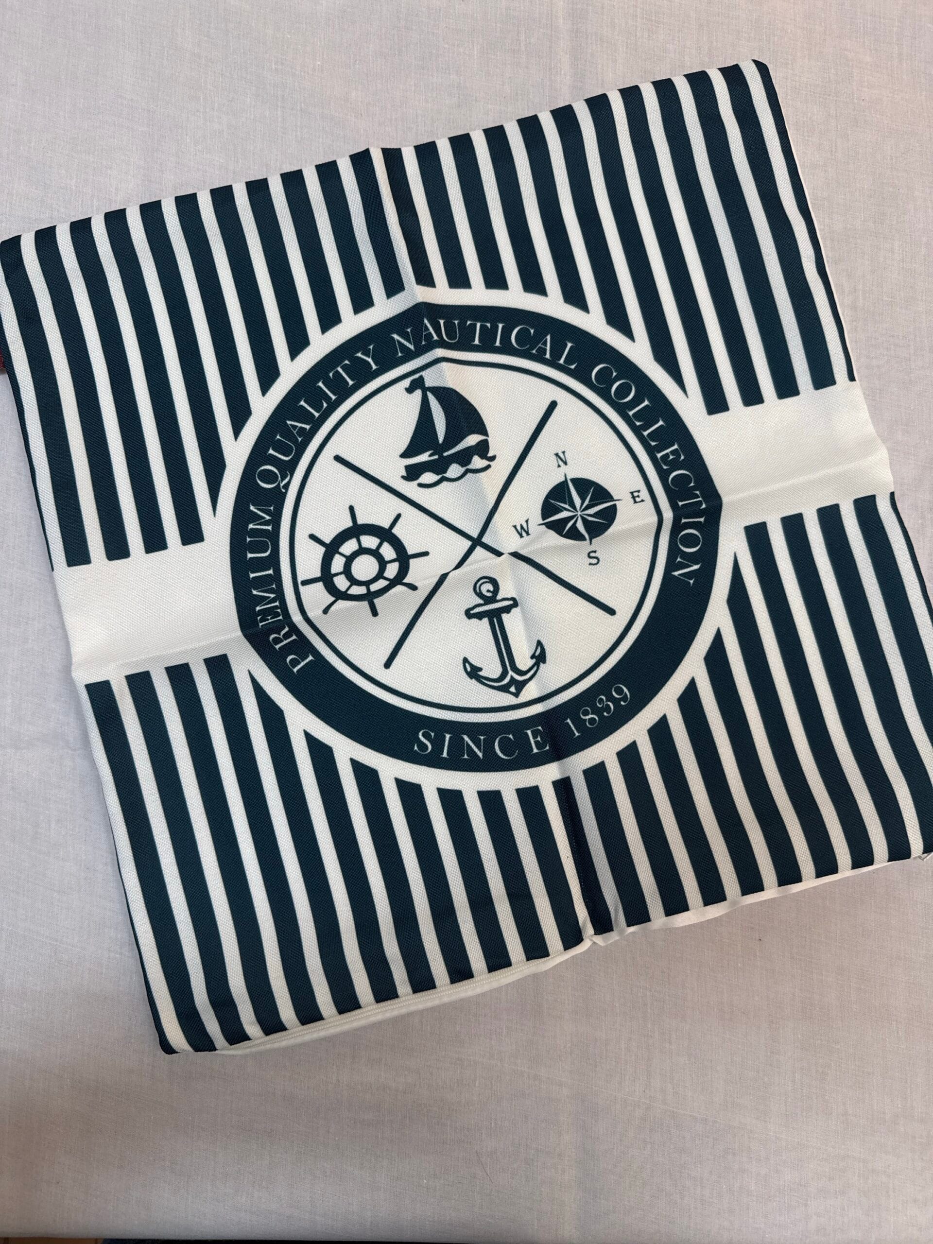 Nautical theme cushion covers feature a bold navy ship motif with chevron borders, adding a maritime touch to your bedding and cushion covers.