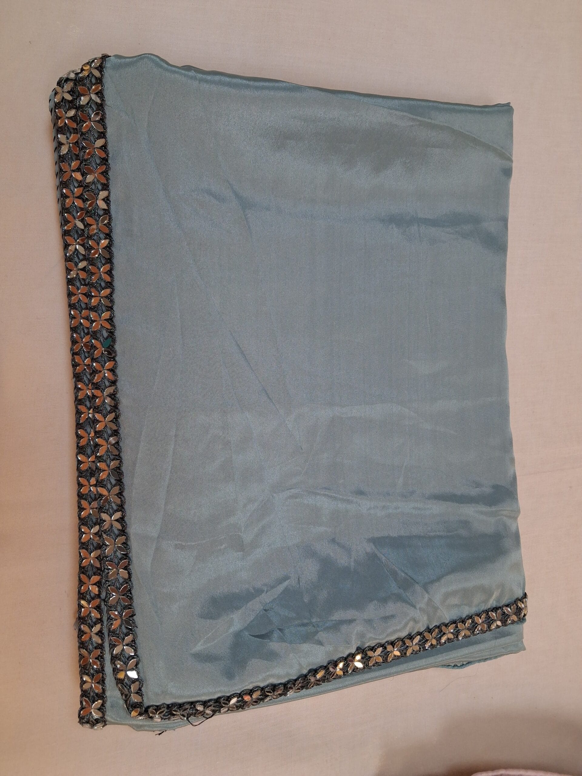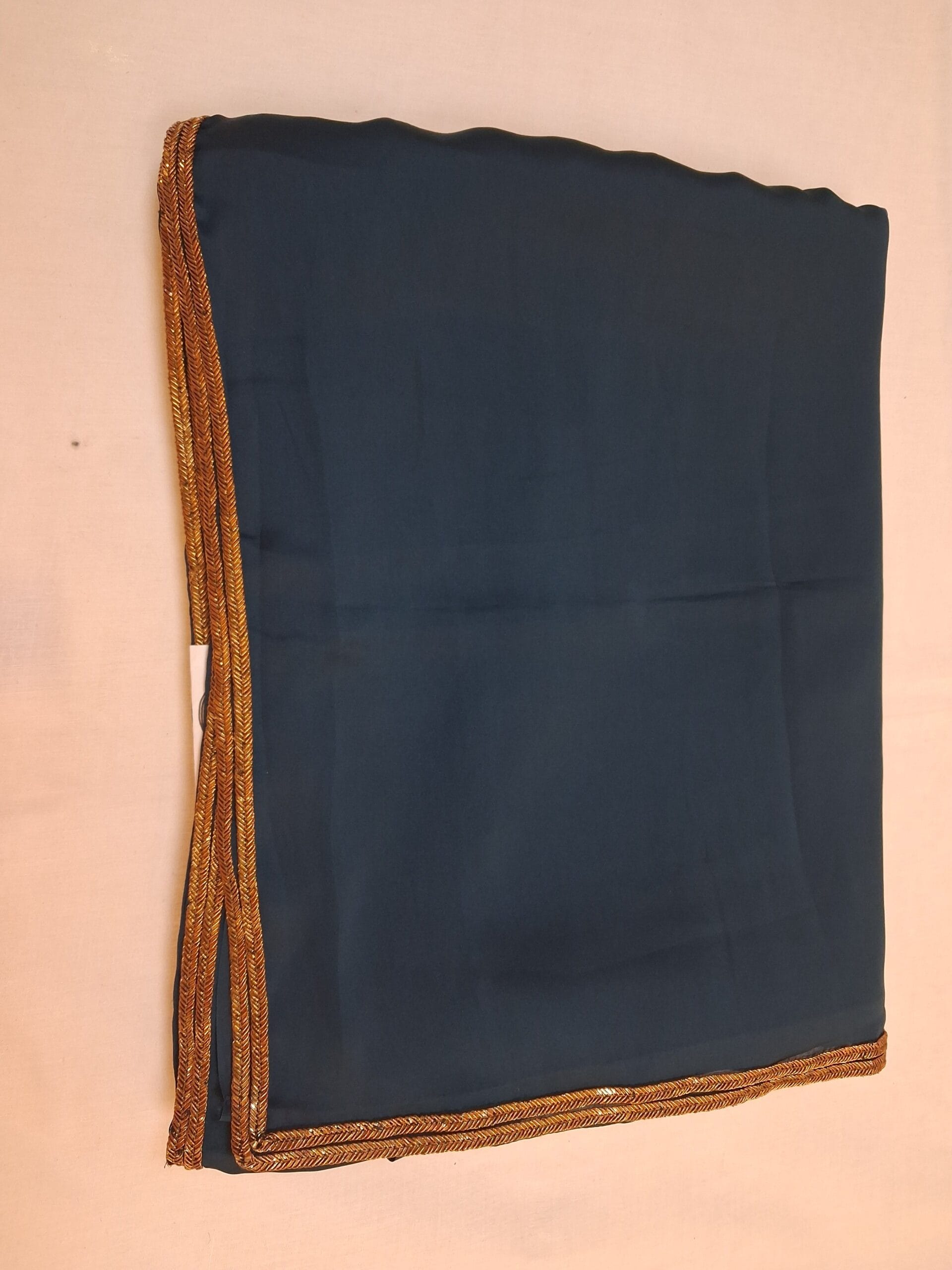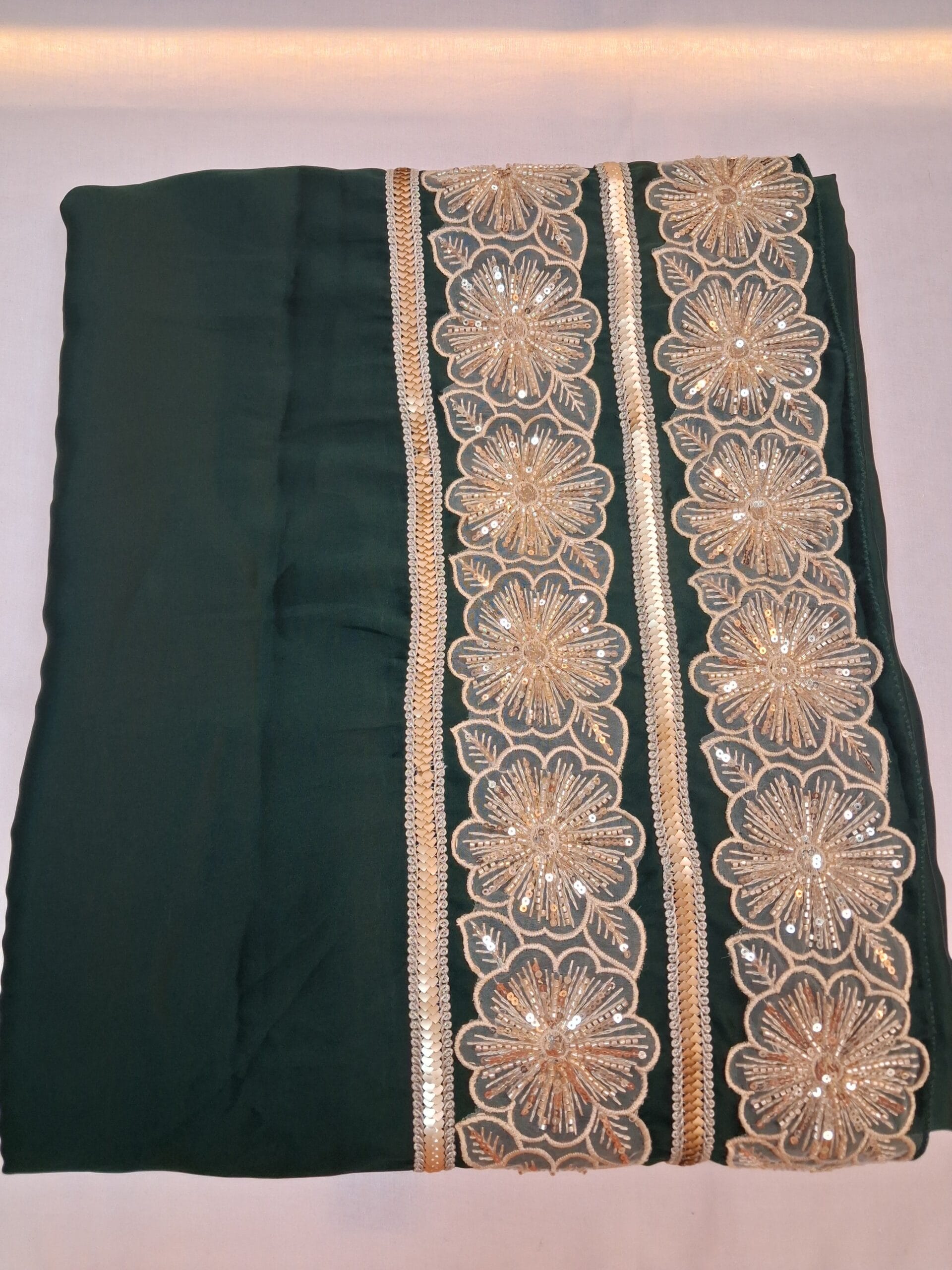 Satin Silk Saree in deep green with intricate gold floral embroidery and sequins along the border.