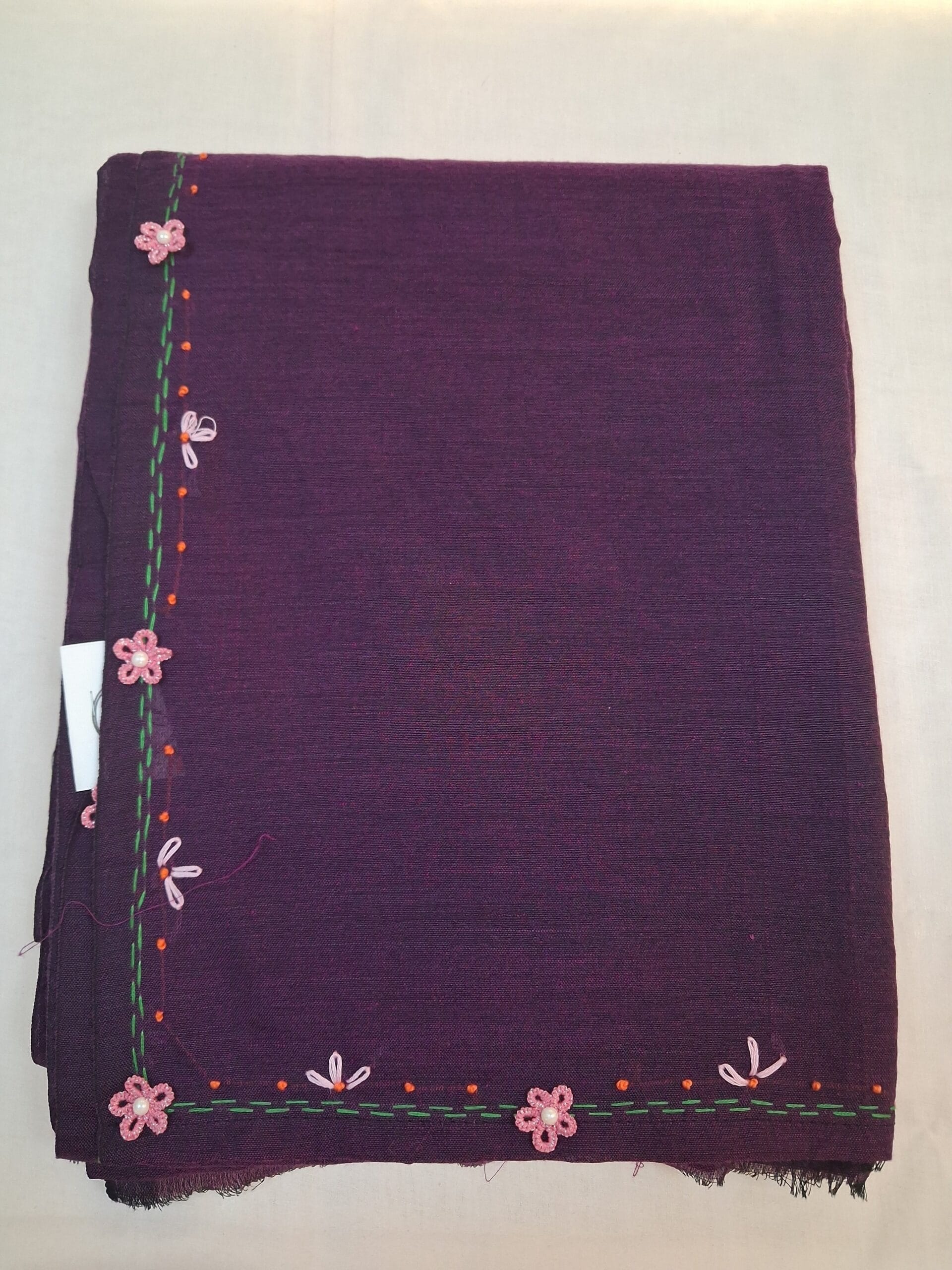 Purple saree with delicate floral embroidery and vibrant thread border adds a charming touch to traditional wear.